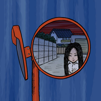先日、お会いした男性の話。深夜、和歌山市の寂しい細道で一人の女性とすれ違った。こちらはバイク、女性は徒歩。ほんの一瞬であったが、美人だったと記憶している。こんな夜中に…?とバイクを止めて振り返ったが、そこにはだれもいなかった。そして自宅付近まで帰ってきたところ、信号につかまり、何気にカーブミラーを覗いたら、なんとさっきの女性が映り込んでいるではないか。あわてて辺りを見回してみるが、そこにはだれもいなかった。それ以来、幾度となく、そのカーブミラーに映り込む同じ女性を見るという。