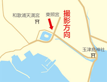 エレベーターの麓には三階建ての望海楼旅館、その左に見える寺院は雲蓋院でしょう。和歌浦南二~三丁目一帯は、市町川沿いの鈴木商店関係の倉庫以外は建物がみあたらず、東側には埋め立て前の干潟が広がっています。和歌山県立博物館に堀田象雲筆の屏風でエレベーターを描いたものが所蔵されていますが、この写真とよく似た視点です。