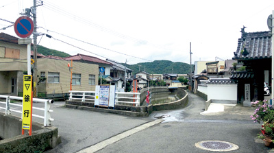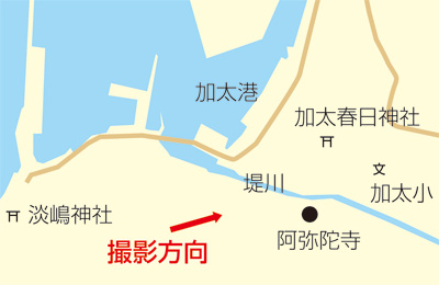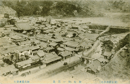 煙出し櫓をのせた家屋や海鼠(なまこ)壁の土蔵が時代を感じさせます。手前の山すそには阿弥陀寺の門があって堤川に架かる木橋は加太橋です。