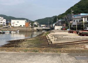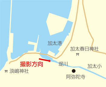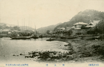 引き上げられた小型木造船は沿岸漁業に従事する漁船でしょうか。帆柱を備えた木造和船も比較的小型のもので、沿岸航路を行き来するものでしょう。帆柱が林立して加太港の繁栄ぶりが偲ばれます。