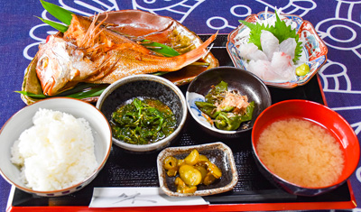 「私自身が和歌山近海や京都・宮津の日本海で釣った魚を塩焼きや煮付けにします。献立はその時、獲れたもので考えます。和歌山のタチウオ、ハタ、アジ、甘鯛、宮津のタラ、メバル、カレイなど。昼は魚定食2種と地鶏定食1種、大漁だった時限定の大漁定食はメーンの魚料理が2品つきます。若い人は煮魚、お年寄りは地鶏が喜ばれます。夜は水炊きやすき焼きなどコース料理や一品料理を出します」