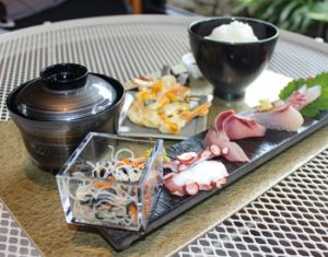 「タイ、ハマチのほか、ブリの幼魚ツバス、タコが多いです。夏場はイカやサザエ、イシダイ、これから寒くなってくるとスズキやブリも出します。春に採れるわかめやひじきなどの海藻類もおすすめですよ」