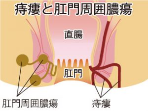 直腸肛門の感染症です。抵抗力が低下していると直腸と肛門の境界にある肛門小裔(しょうか)から細菌が侵入し、肛門括約筋にある肛門腺に感染することがあります。炎症がひどくなって、あちこちに波及し、膿がたまった状態を肛門周囲膿瘍(のうよう)といいます。これは抗菌剤で軽くなることもありますが、完治はしません。悪化すると発熱と肛門の痛みが強くなります。さらに我慢すると膿瘍が破裂し、直腸、肛門と皮膚が瘻管(ろうかん)というトンネルでつながり、難治性の痔瘻となります。こうなると、すぐに切開排膿など処置をしないと、糖尿病など基礎疾患のある方は重症化することがあります。