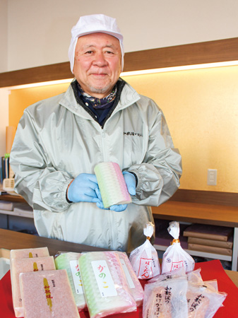 「甘みと香ばしさがくせになる『大板』は、白身魚のシロクチをメーンに3〜4種類を混ぜたすり身を使い、蒸してから焼き目をつけたものです。しこっとした歯触りの良さが自慢で、以前勤めていた店の看板商品でした。赤と緑と白のすり身を塗り分け、彫り細工を施した『かのこ』はおせち料理を華やかに彩ってくれます。美しく細工できるようになるまで長い修業が必要です」