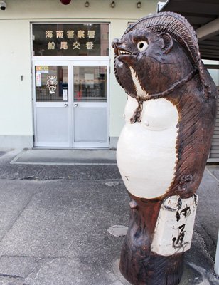 「なぜ船尾交番にタヌキの置物?」。海南警察署警務課の岩本晃一さんによると、「1994年に開かれた世界リゾート博がきっかけです。車で海南インターから来た場合、会場のマリーナシティへは琴の浦交差点を左折するので、目印として設置されました」。なるほど、大きなタヌキは道案内の役割を担っていたのですね。