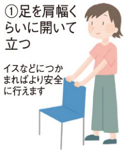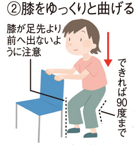 まず、①足を肩幅程度に開いた状態で立ちます。次に、②お尻を突き出すように膝をゆっくりと90度くらいになるまで曲げていきます。膝が足先より前に出ないように注意しましょう。1日に5〜10回・3セットを目安とし、セット間を30秒空けてください。難しければ何かにつかまったり、膝を曲げる角度を少なくしてもかまいません。高齢の方であればイスからの立ち上がり練習でも良いと思います。