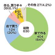 「家で作る」が404人で全体の64%を占めました。 理由は「家族の好物を入れたい」(80歳女性ら多数)、「家族それぞれの好きな物を1品ずつ詰めて完成」(68歳女性)と家族愛からです。うち24人は「伝統の味を受け継ぐため」。「我が家の味を子どもに伝えたい」(45歳女性)、「作っている所を子どもに見てほしい」(45歳女性)、「我が家の伝統の味は4代目」(72歳女性)と気合い充分です。「祖母と母とみんなで作ります」(35歳女性)、「家族みんなで共同作業」(30歳女性)といった方も9人いました。