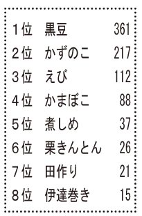 903の回答が集まりました。1位は361票を集めた黒豆。「家庭の味」(38歳女性ほか)が多い中、「自作のがおいしい」(31歳女性)、「上手に煮ることができる」(64歳女性)とドヤ顔が見えそうな回答も。「大晦日からストーブで煮る」(66歳女性)、「2日かけ煮て近所に配る」(66歳女性)、じっくり煮るのがコツのようです。67歳女性は「豆豆しく暮らしたい」と意味を重んじます。