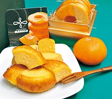 クローバーはちみつと厳選玉子で作るバウムクーヘン。有田産の100%みかん果汁を使った生地は、ほおばると口の中にさわやかな甘さが広がる。食感が残るよう、荒削りして練り込んだ果皮がみかんの香りを強調し、味のアクセントになっている。