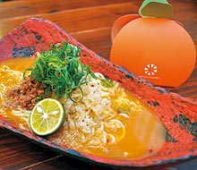 県庁前通り沿いの居酒屋「あぶら坊主」が開発した冷やしラーメン。自家製とんこつ醤油スープに、有田産のみかんジュースを混ぜたスープが特徴だ。あっさりとしたみかんの酸味と程よい甘さが広がり、こってり味が苦手な女性にも人気の一品。