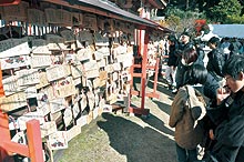 境内の絵馬所には、「絶対合格!」「入学できますように」と書かれた絵馬がびっしりかけられている。小板さんは「年間5000枚近くの絵馬が奉納されます。以前は高校、大学受験が多かったですが、最近は小中学校の入試や就職、資格取得の合格祈願が増えています」と話す。
