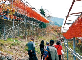 江戸時代初期から串柿の里として知られるかつらぎ町の四郷で撮影しました。串柿作りが始まると、農家の軒先や周囲に、手作業で丁寧に仕上げられた柿が、玉のれんのように整然と並びます。400年の歴史と伝統を育む山里は、琥珀(こはく)色に染まり、訪れる人々を楽しませてくれます。昨年訪れた四郷の串柿まつりでは、300円で機械を使った皮むき体験ができました。昔は農家の奥様方が小刀でむいていました。1個むくのに数秒という速さでした。(写真・文章=和歌山市 ゆーしょーさん)