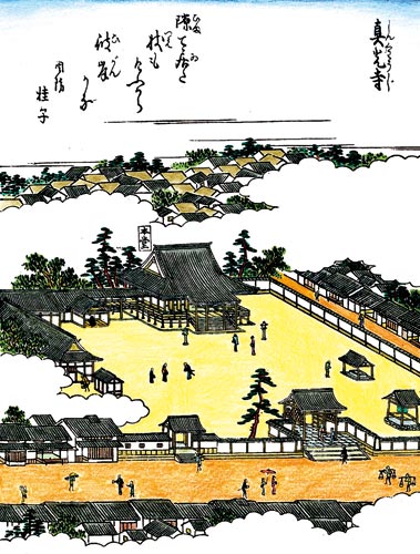 絵図手前の道が新中通で、寺域は塀で囲まれています。山門は新中通に面してあり、その右手に鐘楼、正面に本堂が西向きに建っていました。絵の背景には、町屋が立て込んだ新町の家並みが画かれています。