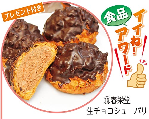 和歌浦の明光商店街にある菓子店、春栄堂の人気商品「シューパリ」のチョコレート味。表面は、シューパリならではの香ばしいアーモンドをイタリア産のチョコレートでコーティングし、中は生クリームとベルギー産のビターチョコレートを混ぜた柔らかなホイップがつまっている。「生クリームのミルキーさとビターチョコのすっきりした上品な甘さに仕上げました。アーモンドのカリカリと、チョコのパリパリとした食感を楽しんで」と同店の南克勲(よしのり)さん。