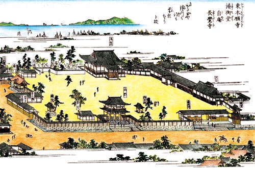 背景には四国・淡路島が配され、長覚寺は鷺森御坊(西本願寺)に勝るとも劣らない、立派な伽藍配置をしています。(和歌山市立博物館総括学芸員 額田雅裕)