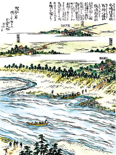 上の絵は、紀ノ川河口に近い北島渡し付近の約200年前の風景です。当時の北島渡しは、城下町の北側、現在の北島橋と河西橋の間にありました。