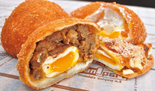 一口ほお張れば、カリカリの衣の中から半熟卵がとろけ出す。具はカレー、ポテト、焼きそばの3種類あり、1日に200個以上売れるカレーパンは、牛すじカレーの辛さをトロトロの卵がまろやかに包み、ボリューム満点。ポテトサラダのマヨネーズ、焼きそばの甘辛いソースも卵と相性が良く、マイルドな味わいがやみつきになる。