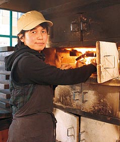 吉川 主人が仲間と一緒に手作業で空き店舗を改装しました。天井に和紙を張り、壁には藁(わら)を混ぜ込んだ漆くいを塗っています。石窯も手作りです。空き店舗を減らして、ぶらくり丁を元気にしようと、まちづくりに取り組む仲間のサポートを受けながら運営しています。