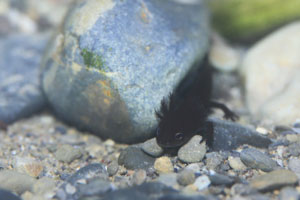 イモリの赤ちゃんははじめ尻尾とエラだけで生まれ、手が生え、次に足が生えます。頭についているウーパールーパーのようなふさふさは外鰓(がいさい)と呼ばれるエラ。このエラは成長して肺が形成されると消え、皆さんおなじみのイモリの姿となります。