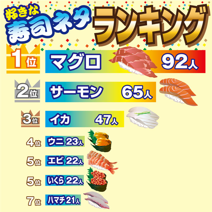 好きな寿司のネタを読者に尋ねたところ、県魚のマグロが堂々の1位に輝きました。2位は小さい子どもからお年寄りまで幅広い世代から支持を集めたサーモン。さらに、イカ、ウニと続きます。夏が近づく前に「体力仕事をしているので」とウナギを挙げる人も。少数派にはカリフォルニアロール、山芋うずらなどこだわりの一品が登場しました。