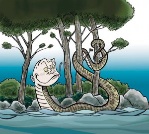 龍神地方でいう川の主で、人面蛇身。これが出た付近では川の水が白や赤に濁ってしまい、魚が一匹も捕れなくなるという。これだけだと、なぜ川の主が水を濁らせ、魚を失くすのかと不思議に思うが、川の水が濁るのは何かしらの環境の変化を意味するし、環境の変化がまた魚を棲めなくする。つまるところ、川の主が現れるのは、自然破壊や災害の警告ともとれる。昔から〝○○の主〟が現れたら災いに転じる伝説は多いのだ。