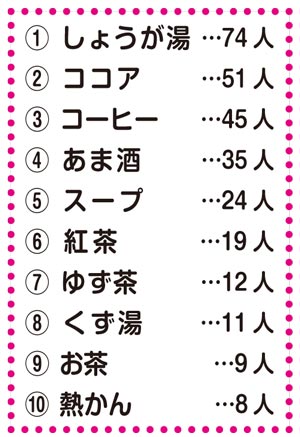 寒くなると温かい飲み物がほしくなります。ダントツ1位はしょうが湯。2位のココアを引き離しただけでなく、他の飲み物にしょうがを入れる人も多いのが特徴でした。3位はコーヒーですが、あま酒、ゆず茶、くず湯と日本的な飲み物が根強い人気です。(回答数297)
