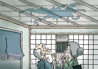 激しい雨の降る晩 、富貴村(現在の高野町)のとある家の天井が急に激しく揺れはじめ、タコのような妖怪が現れた。それは天井をニョロニョロと這い回り、ひとつの目は天を、もうひとつの目は地を睨み、手足の先から水を吐き出した。家人はガタガタ震えていたが、しばらくして雨がやむと妖怪は音もなく消え去ったという。よほど恐ろしかったのだろう、家人は言った。「世の中で、虎、狼よりも、もるど恐ろし」と…。実はこの妖怪、〝漏奴〟という漢字があり、雨漏りが語源となっている。昔の人は皆、雨漏りを恐れた訳だ。