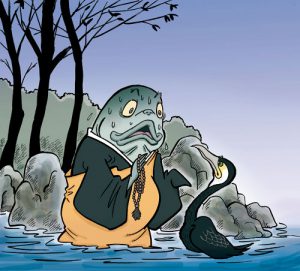 魚を捕っている人に「あまり捕り過ぎないように」とエコロジカルに戒める「岩魚坊主」という岩魚が化けた妖怪が有名だが、和歌山には、岩魚ならぬ「雨魚坊主」がいる。雨魚は和歌山でいうアマゴのこと。この雨魚が年をとると、雨魚坊主に化ける。岩魚坊主とは違って悪知恵にたけ、坊様の姿で人家を回って悪い事ばかりをする。見た目は徳の高い坊様なので、人々は手厚くもてなすが、それをいいことに、次々に人々を惑わしたという。そんな雨魚坊主も、元は魚。水鳥が大の苦手で、水鳥の声を聞くだけですばやく逃げるらしい。