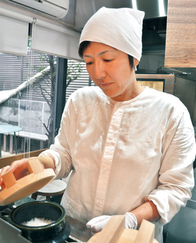 客席に届く膳(ぜん)に小さな土鍋が一つ。木蓋(ぶた)を開けると、蒸気と共に白米の甘い香りが立ち上がる。