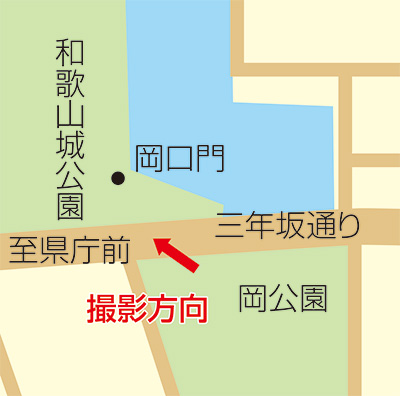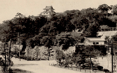 松田茂樹さんの『和歌山城史話』によると、和歌山城の創築当時は三年坂堀と東堀はつながっていて、岡口門前には木橋が架かっていましたが、浅野時代に埋め立てられて現在見るような陸続きとなったことが紹介されています。概ね大正中ごろの光景と思われます。