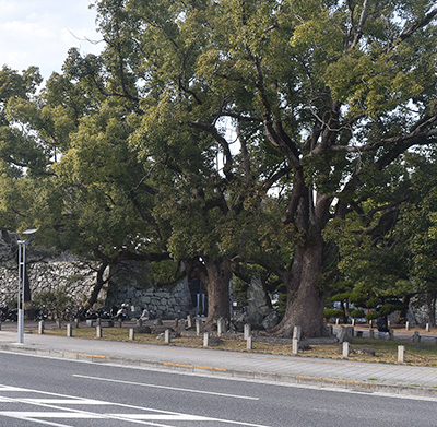 写真=石碑前に茂ったクスノキで岡口門もお城も見えない