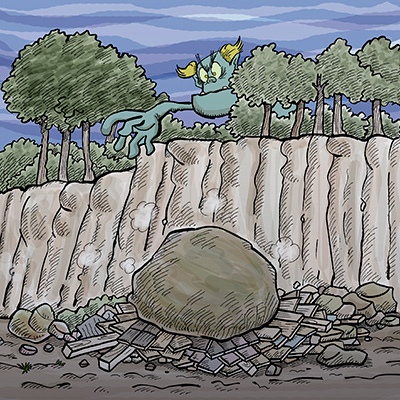 昔、龍神村の山で多くの労働者が仕事をしていた時、炊事係の男が仕事の無事を願い、山の神に飯を供えていた。その度、お経を知らないので、「般若心経」とだけ唱え拝んでいた。ある晩、労働者たちが寝る時、小屋の外から「ハンニャシンギョウ、出て来い」と喚く者がいる。皆は恐がり、その炊事係を外へ押し出した。炊事係は誰ともなしに導かれ、自分の家へ戻った。その後すぐ、また、「やるぞー、やるぞー」との声が小屋を包んだので、労働者たちは怖さ半分、「やれるもんならやってみろ」と怒鳴り返した。すると、大石が何処からともなく転がり落ちてきて小屋を押し潰し、皆、死んでしまったという。