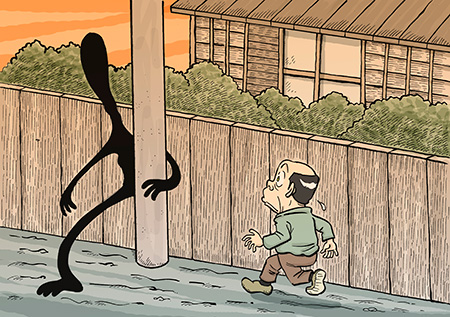 昭和30年代、和歌山市の某所での話。町内でもその家は大きいお屋敷だった。板塀が長く続き、塀の向こうには植木がきれいに剪定されていた。本来なら、植木を眺めながら歩くその道は心地よいものなのに、何度通っても奇妙な気配を感じた。ある日、いつものようにその道を歩くと、これまで以上に気配を感じる。早く行き過ぎようと、足を速めた次の瞬間、塀の脇に建つ電柱の影から、真っ黒で、ひょろひょろした、背の高い人影がゆっくり現れた。人影はこちらに気づいたように、塀をまたいで家の敷地に入っていったという。
