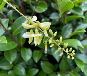 フジと言えば、4月ごろに紫色や白色のたくさんの花が房のように垂れ下がって咲き、いい香りを漂わせる植物を思い浮かべるでしょう。でも、梅雨の時期から咲き始めるフジもあるのです。それが今回紹介するナツフジです。別名ドヨウフジと言い、一年で最も暑いとされる夏の土用のころにも咲いていることからこう呼ばれたと思います。