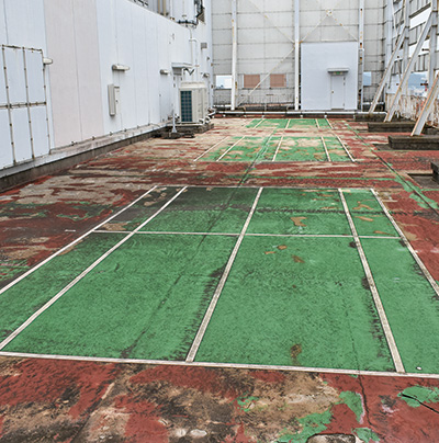 周りの建物から見ることができないので、特別に屋上へ入れてもらったところ、小さなテニスコートのようなものが3つ並んでいますが…、これは?