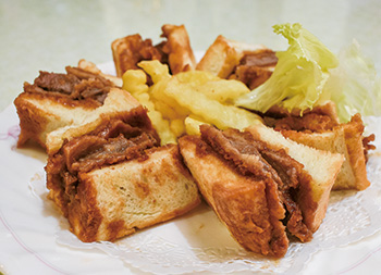 「トマトペーストをベースにお酢や砂糖などで作った、30年前から変わらないオリジナルデミグラスソースです。肉厚で食べごたえのあるビーフカツ、アクセントは辛子マヨネーズです。見た目は分厚いですけれど、とてもやわらかく、かむと肉汁とともにソースの甘みと酸味が感じられます。リピーターが多く、年配のお客さんもよく買って行かれます。ビールにも合いますよ」