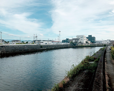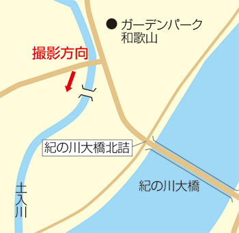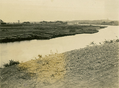 紀の川河口近くにあったこの中洲は河川改修工事により、一部は紀の川右岸に取り込まれ、一部は紀の川の本流となって姿を消しました。この写真は現在の土入川の久三橋のやや下手から南南西に向けて中洲を撮影したようです。遠くに青岸から荒浜にかけての松林が見えます。