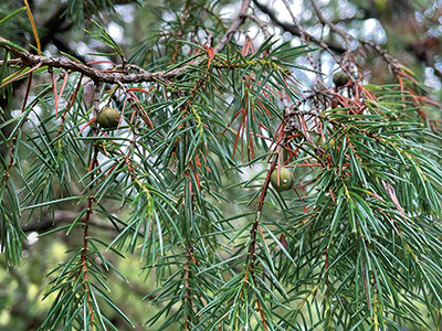 ムロノキの現在の名前には2つの説があって、その一つがネズミサシです。「ネズミを刺す」が語源といわれます。実際に鋭い針のような葉をネズミの侵入防止に用いたのかどうかは分かりませんが、面白い名前ですね。でも、肝心の「刺す」という部分を省いて、ただ「ネズ」とだけ呼ばれることもあります。また、盆栽にすると「杜松(としょう)」となります。