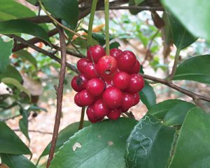 秋になると木々は葉を落とし、野山は少し見通しが良くなったように感じます。そこで目立ってくるのが木の実です。その中でも赤い実が一際目を引きます。サネカズラもその一つで、他の木や金網のフェンスなどに巻き付くつる植物です。