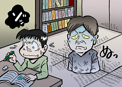 和歌山市に住むKさんは子どものころ、自分の部屋で寝るのが怖かった。夜になると、畳の下から男の声が聞こえてくることがあったからだ。その部屋は1階で、畳の下に人などいるはずもなかった。ある夜、宿題をしていると、どうにも背中に気配を感じる。怖かったので、振り向きもせず、必死で教科書にかじりついていた。やがて気配が声に変わった。何を言っているかは聞き取れないが、いつも聞く畳の下のあの声だ。とっさに声の方へ目をやると、同じ目の高さで見知らぬ男と目が合った。その男は畳から浮き出てきたかのように、こちらを眺めていたという。