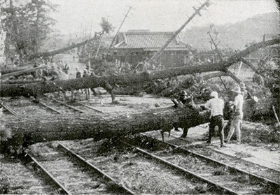 和歌街道の松並木の巨木がなぎ倒されて電車線路と道路をふさいでいます。昭和九(一九三四)年九月二十一日の室戸台風によるものです。