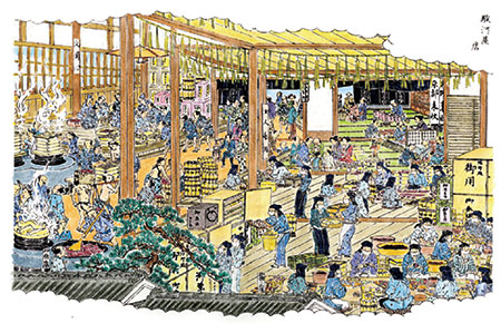 京都伏見で、初代・岡本善右衛門が「鶴屋」の名で饅頭処を始めたのがルーツです。駿河屋の蒸羊羹(ようかん)は、豊臣秀吉の茶会に用いられ絶賛を受け、その名前は全国に轟きました。