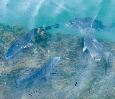 行ってみると、黒い魚影が橋の上からでも見えました。中々の大きさで、丸々とおいしそうに見えますが、周りに釣り人の姿はありません。禁止されているのでしょうか。
