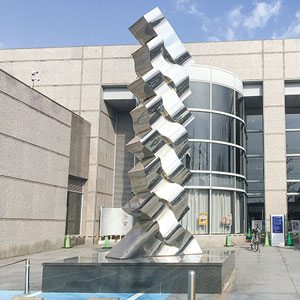 大きく、入り口近くにあるので、必ず視界に入る幾何学的な形のモニュメント。作者はこの作品にどんな意味を込めたのでしょう。