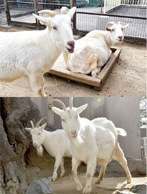 今回はヤギについて話します。和歌山城公園動物園では、オスとメスで園舎が分かれています。オスは、体が大きくてあごに肉垂(にくすい)のあるムギくんと、体が小さく、ひげが生えているジョーカーくんの2頭。メスは当園で産まれた2頭の姉妹で、肉垂があるのがスズ、ないのがシュシュです。
