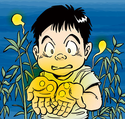 60代のMさんが子どものころ、貴志川では今ごろの季節になると、蛍が多く見られたそうだ。田んぼの周辺に淡い光を放ちながら舞う蛍。当時はよく網を持って、その光を追いかけた。捕まえた蛍は虫かごや蚊帳の中へ放して、ほのかな灯りを楽しんだ。ある日、夜中に目がさめたMさん。なにげに庭へ目をやると、ふわふわと蛍が飛んでいる。その光に導かれるように庭へ出て、掌でそっと包み込むように捕まえた。掌の中に蠢く様子が感じられないので、手を開くと、いくつかの光がふわ~っと飛び出した。それは蛍ではなく、小さな光の玉であったという。