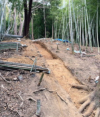 昨年は県教育委員会により発掘調査が行われ、その構造や、段築と呼ばれる段差が確認されました。古墳の南側に基壇と呼ばれる平坦面を設けることで、古墳が壇の上に載ったように大きく見せています。また古墳の前面部分は半分以上を盛土で造り、4段の段築を設けていて、正面から見た時に圧倒的な高さと幅を感じさせる視覚効果があります。現地を訪れると、その大きさに驚くと思います。この古墳は見た目にこだわっていたようです。また背後の山頂には、数世代前の首長墓である大日山35号墳があります。