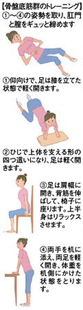 腹圧性尿失禁の治療では、骨盤底筋群のトレーニングが効果的です。骨盤底筋は、「内臓が下がらないように支える」「尿をとどめたり排出したりする排泄コントロール」「姿勢の安定」に関わる大切な筋肉です。骨盤底筋は単独で動く筋肉ではないので、他の筋肉と一緒に動かすことで有効性が高まります。左図で、家事や仕事の合間にできる、簡単な運動を紹介します。