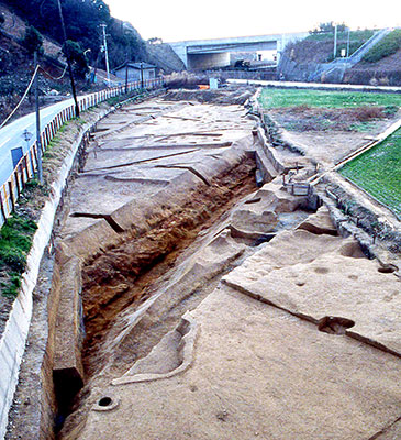 音浦遺跡の隣にある花山丘陵には、この溝と前後する時期に岩橋千塚古墳群で最初の前方後円墳となる花山8号墳(全長約52㍍)が築かれました。このことから、同古墳群に葬られた初期の有力者たちは、この名草溝を築いた「紀氏」だったのではないかと推察できます。