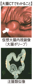 ただし、突然の発症や症状が急速に増悪した場合、貧血、予期しない体重減少、血便、微熱、大腸がんなどの消化器悪性腫瘍の既往歴や家族に病歴のある人がいる、50歳以上である等に該当する方は、器質的疾患を否定するためにも、精密検査として消化器内視鏡検査を受けてください。最近では前処置の下剤が少量で済む大腸CT検査(写真)もあります。消化器病専門医、大腸肛門病専門医にご相談ください。